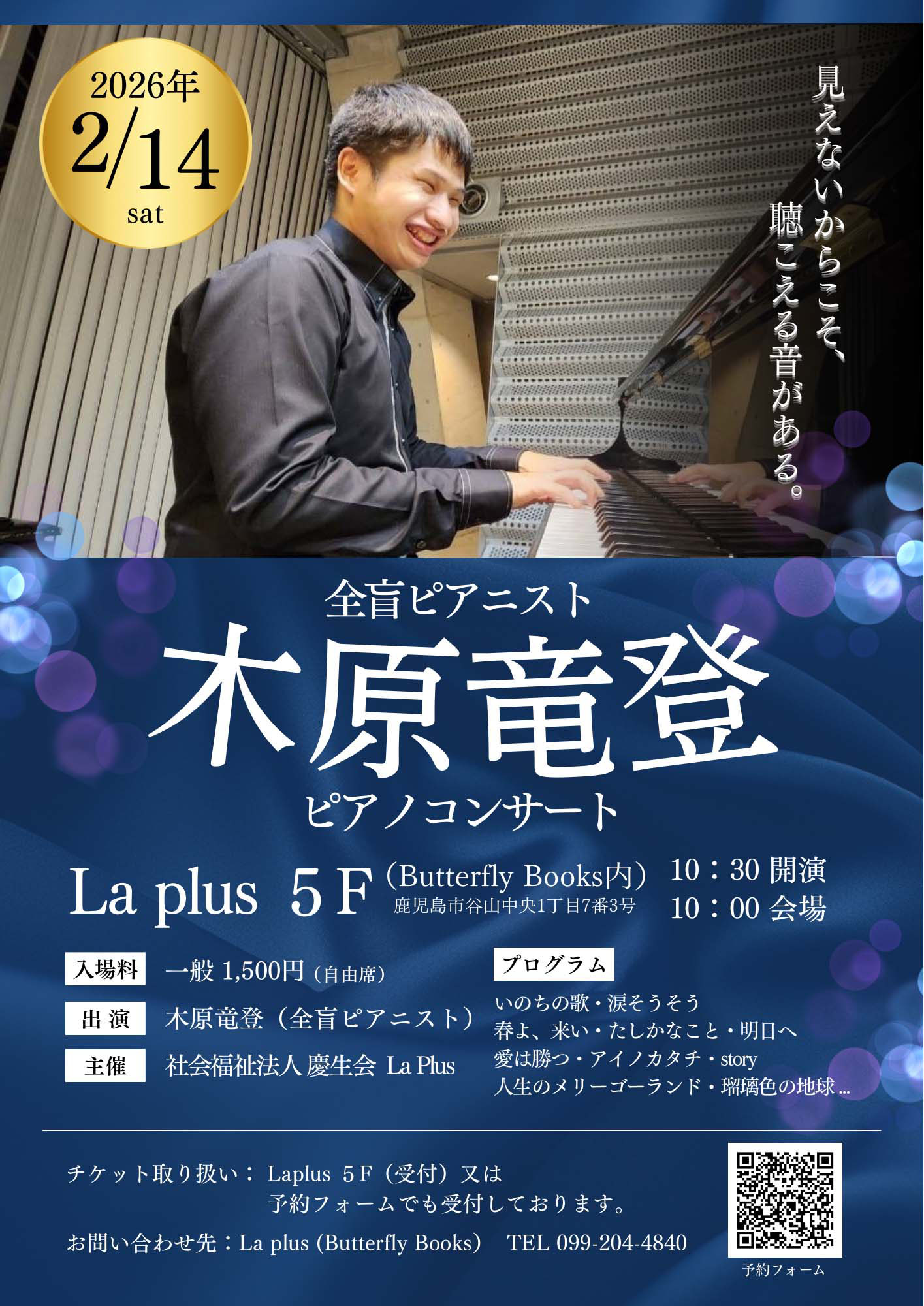 2026年2月14日(土)全盲ピアニスト 木原竜登(きはら たつと) さんによるピアノコンサートを開催します。