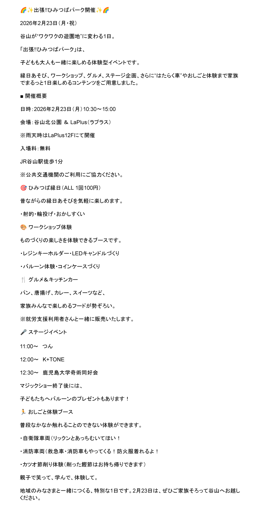 2月23日(祝月)『出張‼︎ひみつばパーク』開催のお知らせ 投稿日:2026年02月13日 🌈🌟‼ひみつばパーク開催🌟🌈2026年2月23日(月・祝)、谷山が“ワクワクの遊園地”に変わる1日。「出張ひみつばパーク」は、子どもも大人も一緒に楽しめる体験型イベントです。縁日あそび、ワークショップ、グルメ、ステージ企画、さらに“はたらく車”やおしごと体験まで家族でまるっと1日楽しめるコンテンツをご用意しました。