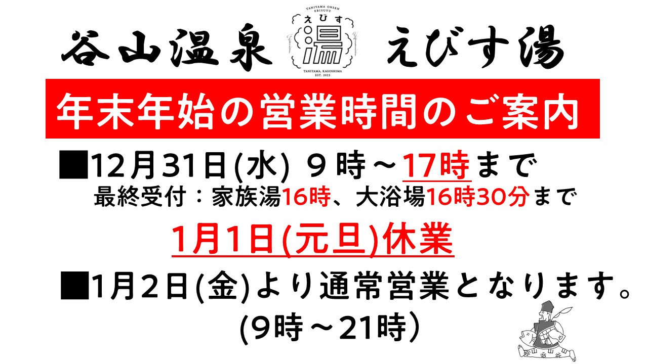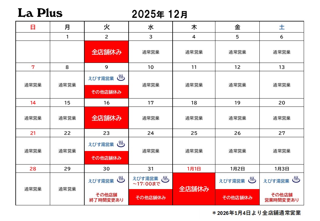 La Plus 年末年始の営業日につきまして 投稿日:2025年12月09日 日頃はLa Plus各店舗のご利用ありがとうございます。 年末年始の営業日は下記の通りになります。 えびす湯の営業時間が異なりますので、そちらもご参照ください。
