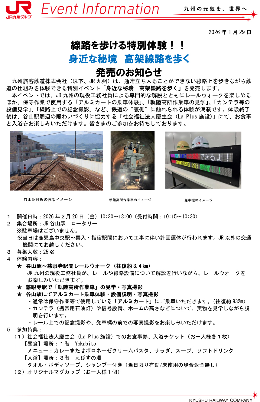 にぎわいパートナーJR九州さまからのお知らせ 投稿日:2026年01月31日 慶生会La plusとのにぎわいパートナーでありますJR九州さまのイベント案内です。 当日はLa plusでもお食事場所として「yokabito」、入浴場所として「えびす湯」でお楽しみ頂ける内容となっております。 詳しくは下記をご覧ください。